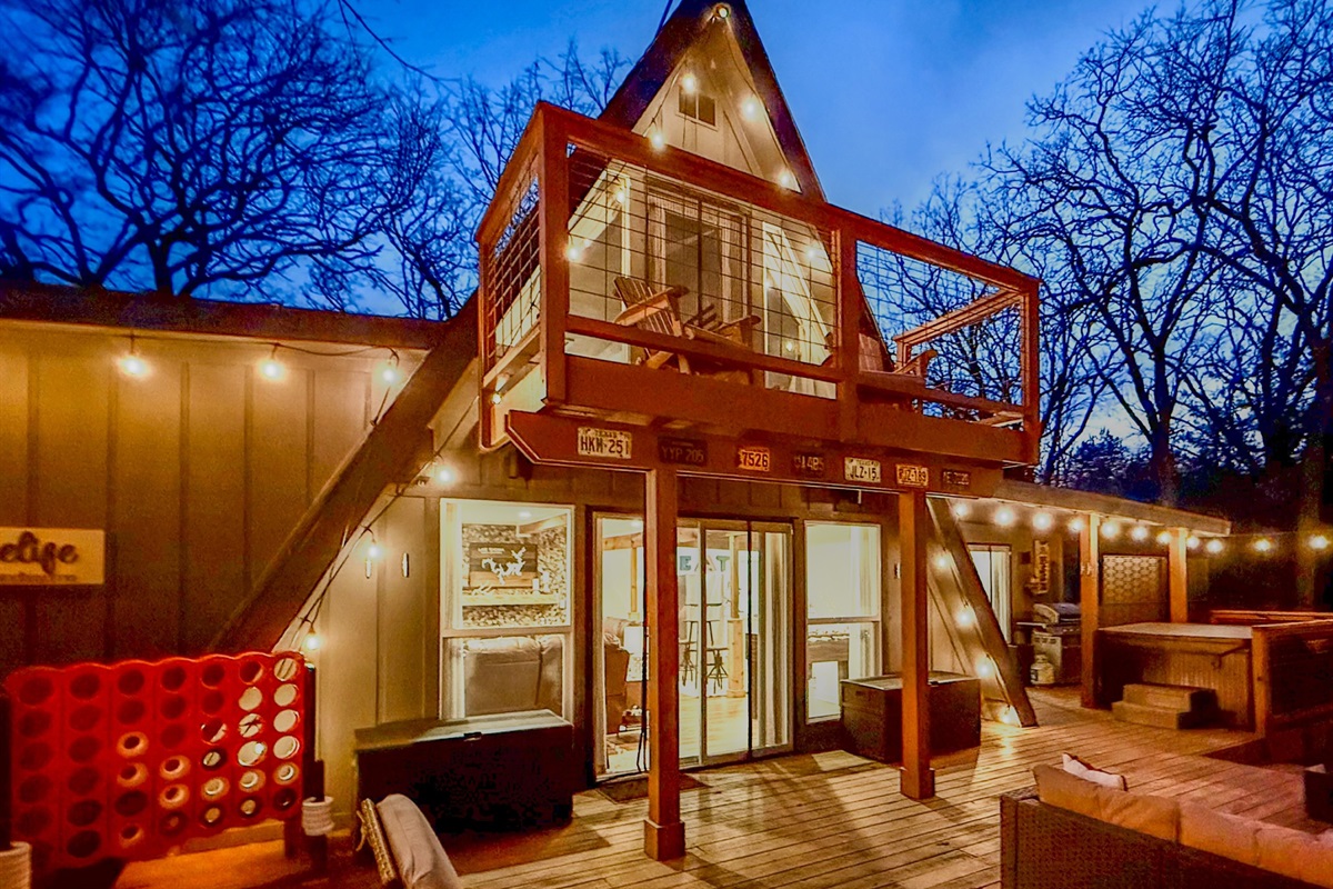 3 Bedrooms • 2 Bathrooms 2 Baths • Sleeps 6Just a short walk from Lake Texoma, ‘A-Frame of Mind’ offers outdoor enthusiasts a gorgeous retreat that's fully updated with lots of designer touches. Boasting 2 KAYAKS, a neighborhood BOAT RAMP, and plenty of parking, this 3-bedroom/2-bath cabin, is a lakeside treasure. Hike the on-site trails surrounding the lake or play FOOSBALL. After fun-filled days on the lake boating & enjoying the islands' sandy beaches, relax in the HOT TUB, hang out by the fire or play yard games with your loved ones. This cozy cabin will definitely feel like your home away from home!