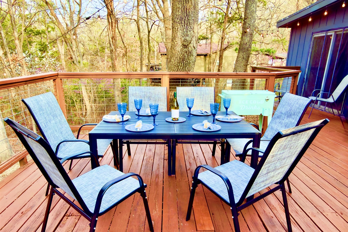 OUTDOOR LIVING: Private yard, spacious 800 sf deck, upstairs balcony, fire table (propane provided), fire pit (roasting sticks and marshmallows are provided, but wood and starters are not), outdoor cooler, outdoor seating and dining for 6 (dining furniture not pictured yet but has replaced the two sun loungers and bistro set), hammock, frisbee golf, cornhole, giant Connect 4, yard dice, lots of other outdoor games